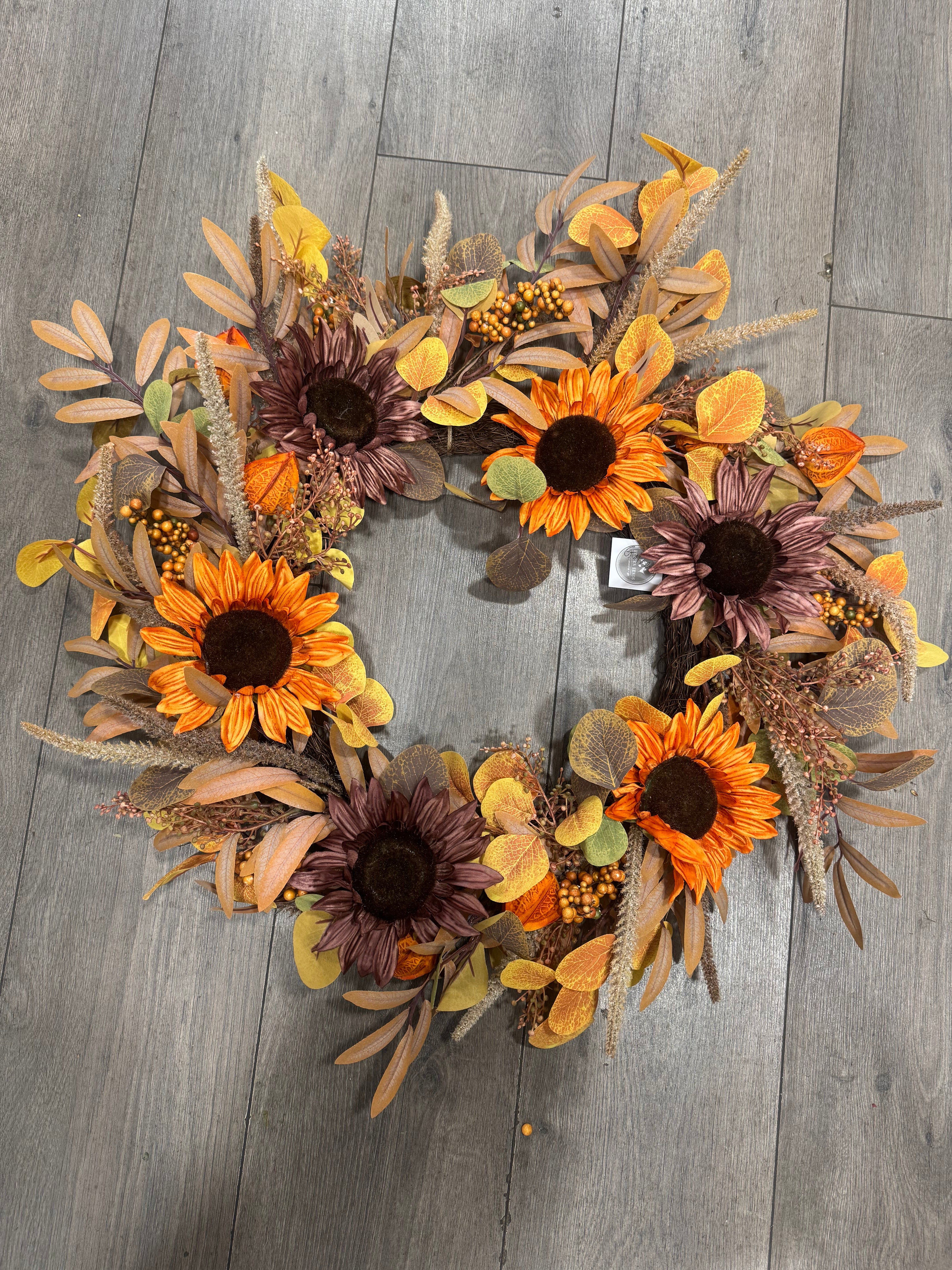 This autumn, bring the beauty of the season into your home with our stunning sunflower wreath. Made with a mix of autumn tones and textures, this wreath will add a touch of warmth and charm to any space. Handcrafted with care, our wreath is the perfect addition to your fall decor.