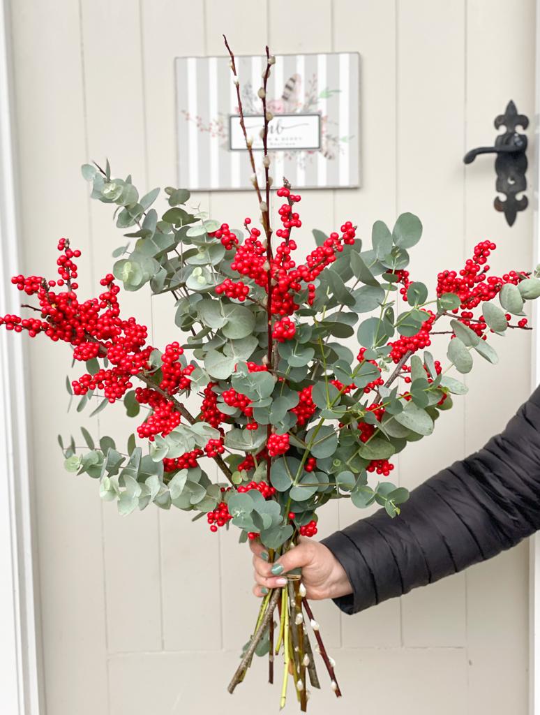 A beautiful hand tie bouquet of Christmas foliages, including eucalyptus & red berries. Long lasting and will bring that perfect scent of Christmas into your home!