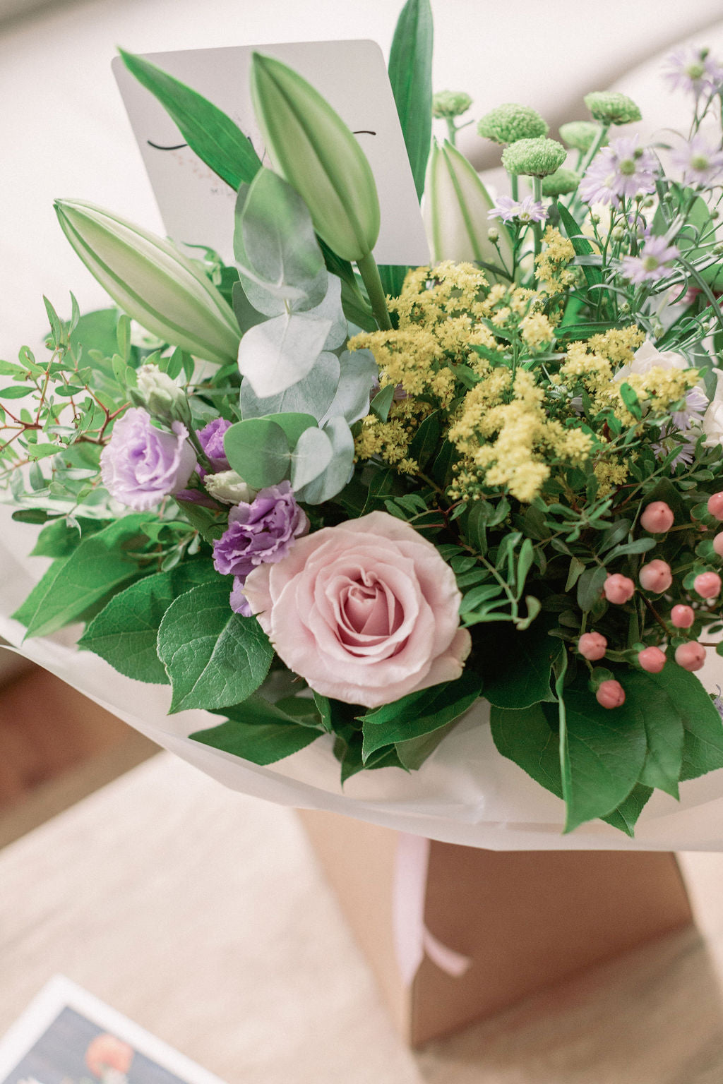 A fabulous bouquet of seasonal fresh flowers, wrapped and displayed in a gift box.