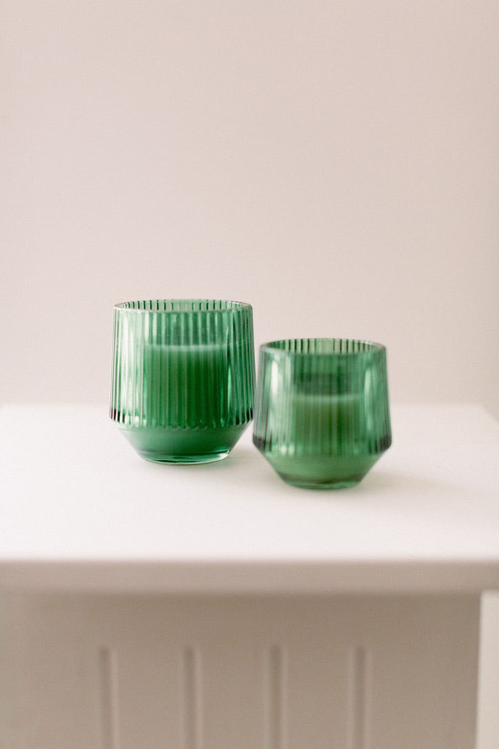 Upgrade your candle game with our Green Glass Candle Set. Both large and small candles come in a soothing green ribbed glass, emitting a fresh and relaxing scent. Perfect for creating a calming and inviting atmosphere.