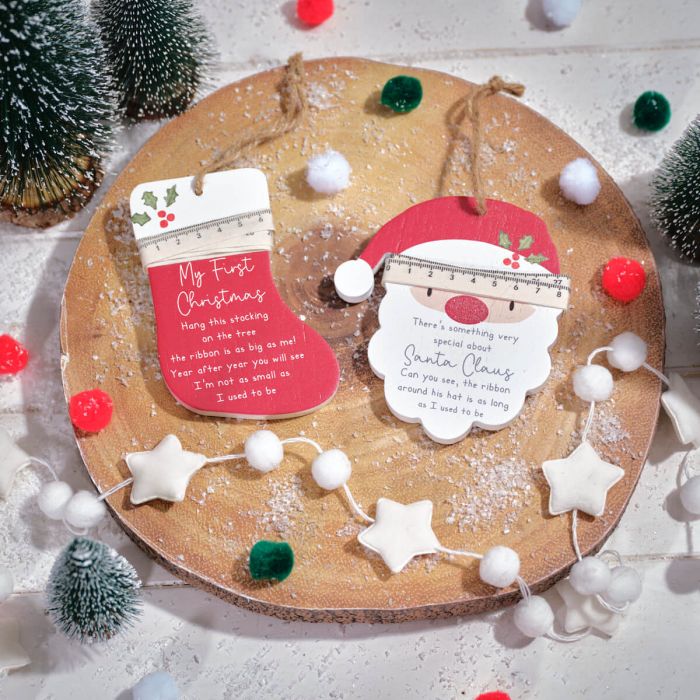 Hang this decoration on the tree with the measuring tape ribbon measuring the height of the baby - year after year you will see the baby is not as small as they used to be.