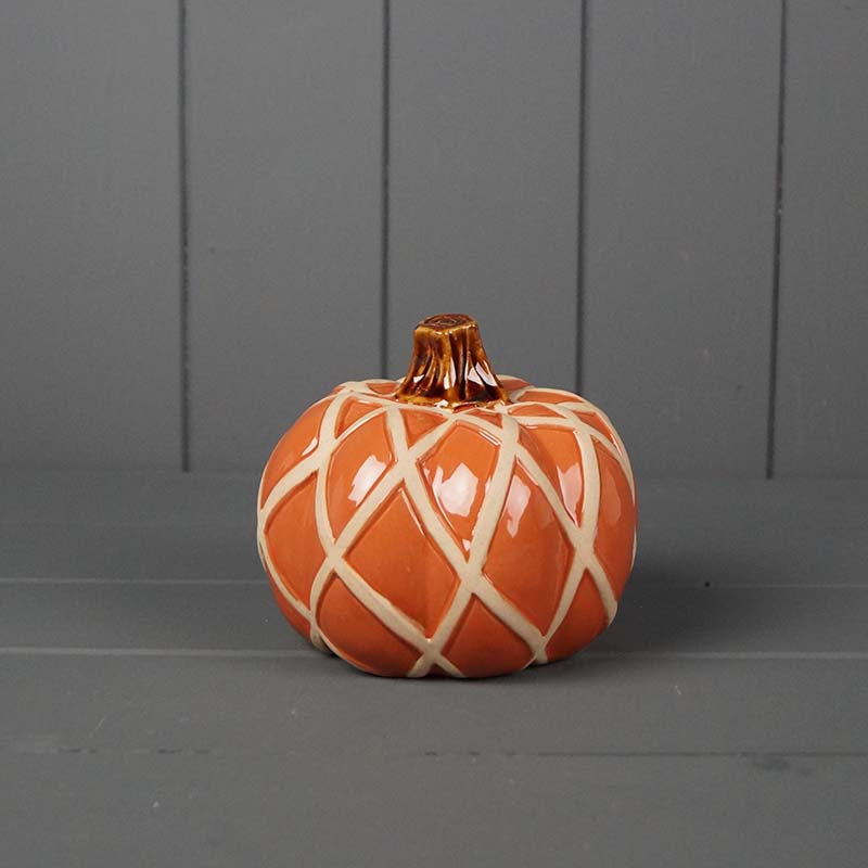 Expertly crafted with ceramic material, this 10.5cm pumpkin features a charming cream checked detail. Ideal for adding a touch of autumnal charm to your decor, this pumpkin is sure to impress with its beautiful design and durability. Make your space stand out with this lovely orange checked ceramic pumpkin.