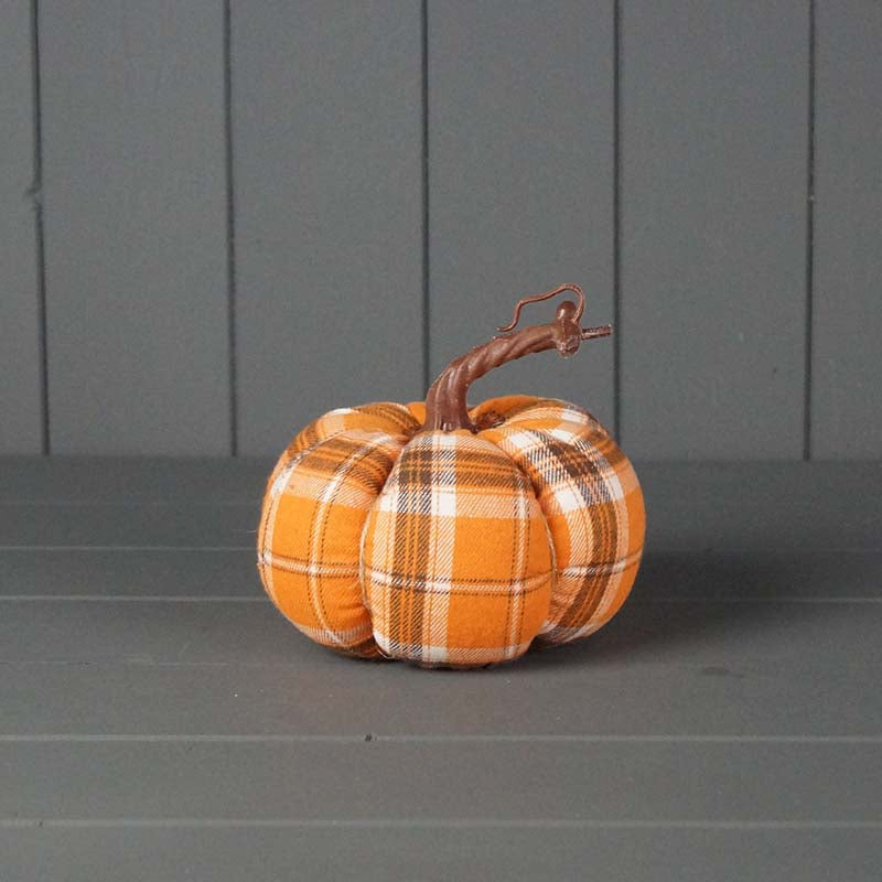 Enhance your fall decor with our Orange Fabric checked pumpkin. Its beautiful tartan design in warm autumn tones will add a touch of seasonal charm to any room. The intricate stem detail adds a realistic touch, making it a perfect addition to your autumn home decor.