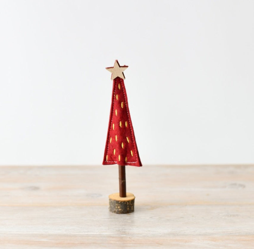 SMALL RED FELT CHRISTMAS TREE ON BASE, 20CM