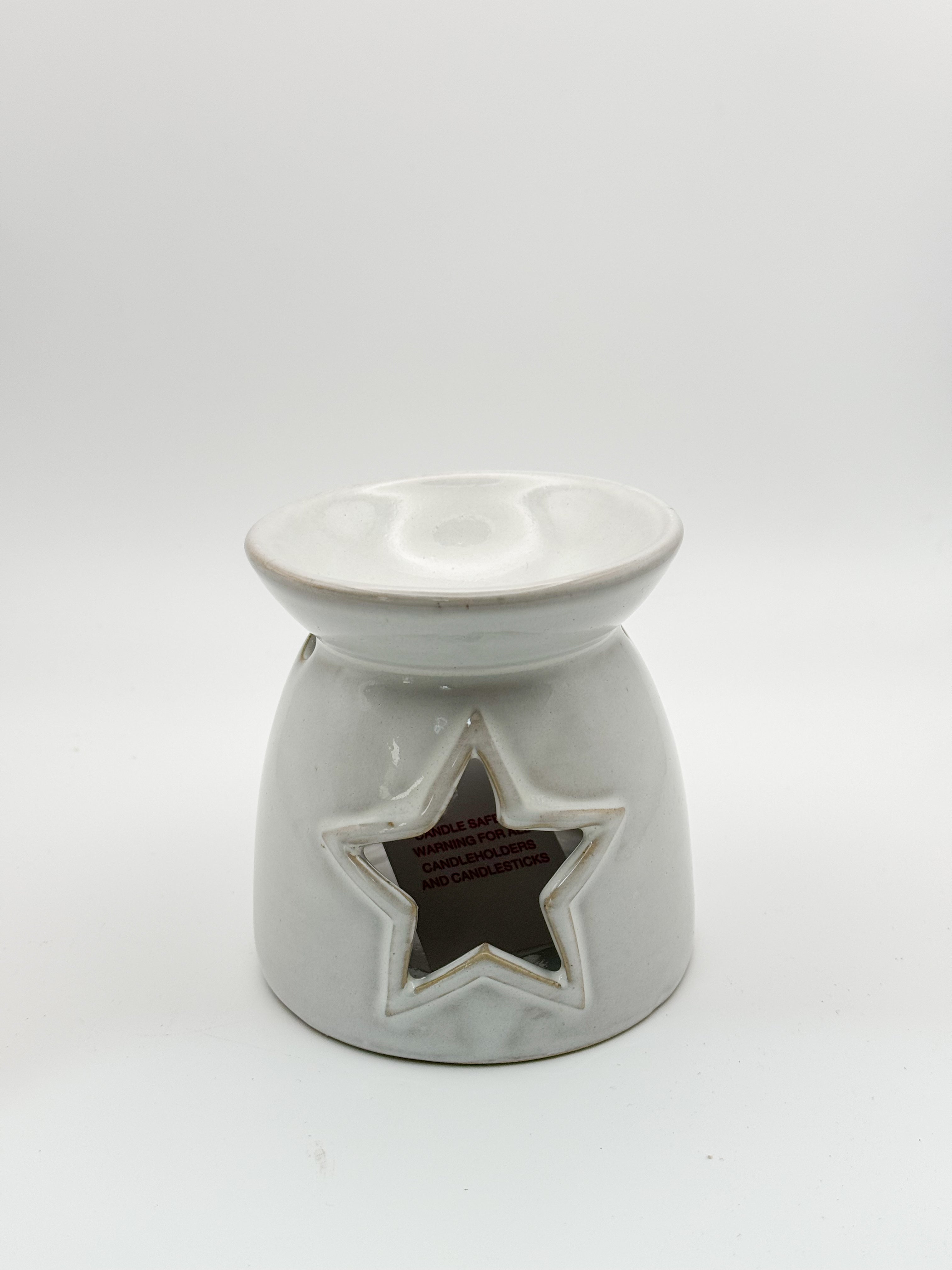 This glazed ceramic wax melt burner features a star cut out design that adds a touch of elegance to any room. With a sturdy base and ample space for wax melts, this burner is a durable and convenient choice for creating a warm and inviting atmosphere.